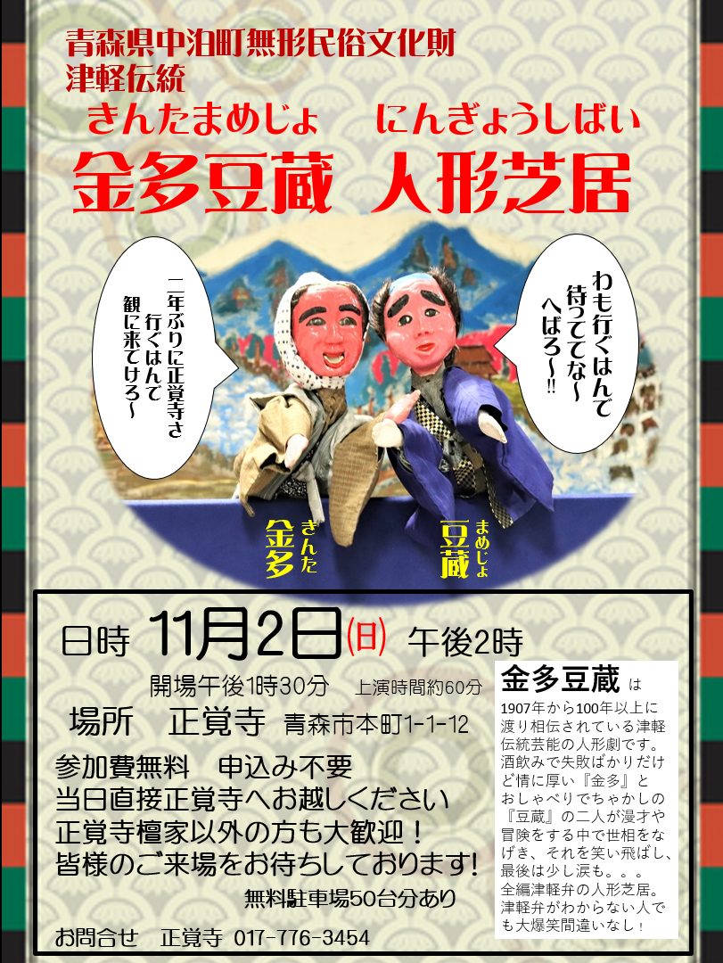 金多豆蔵人形芝居 ご案内 2025年8月2日 最終更新日時 : 2025年8月3日 shogaku55 11月2日㈰午後2時より 『金多豆蔵人形芝居』を正覚寺にて2年ぶりに開催いたします。青森市に金多と豆蔵がやってくる貴重な機会です。正覚寺の檀家さん以外の方のご来場も大歓迎です。たくさんの皆様のご来場をお待ちしております。